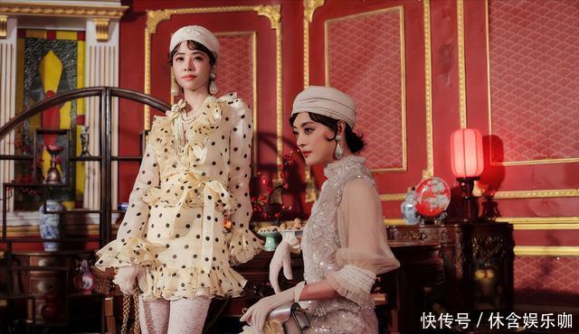 还有一套造型,蔡依林穿着黄色的波点套装,搭配白色镂空丝袜。孙俪穿着棕色的网纱套装,搭配同款白色镂空丝袜,二人还都戴着白色礼帽。