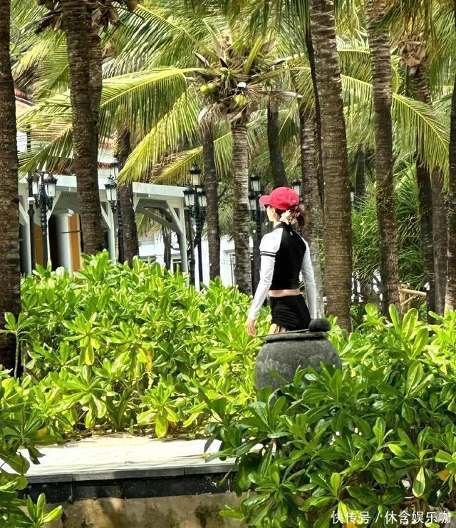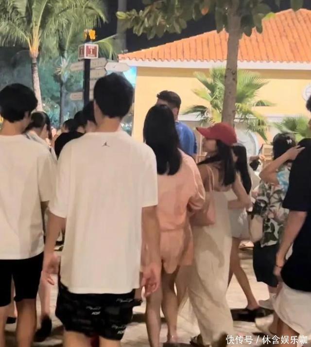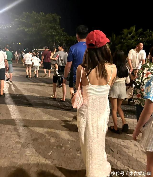 头上还是那顶粉帽子,换了一件有花边的黑体恤,胳膊上可以看到纹身。之后又有网友在前往海滩看烟火晚会的队伍中偶遇了她。