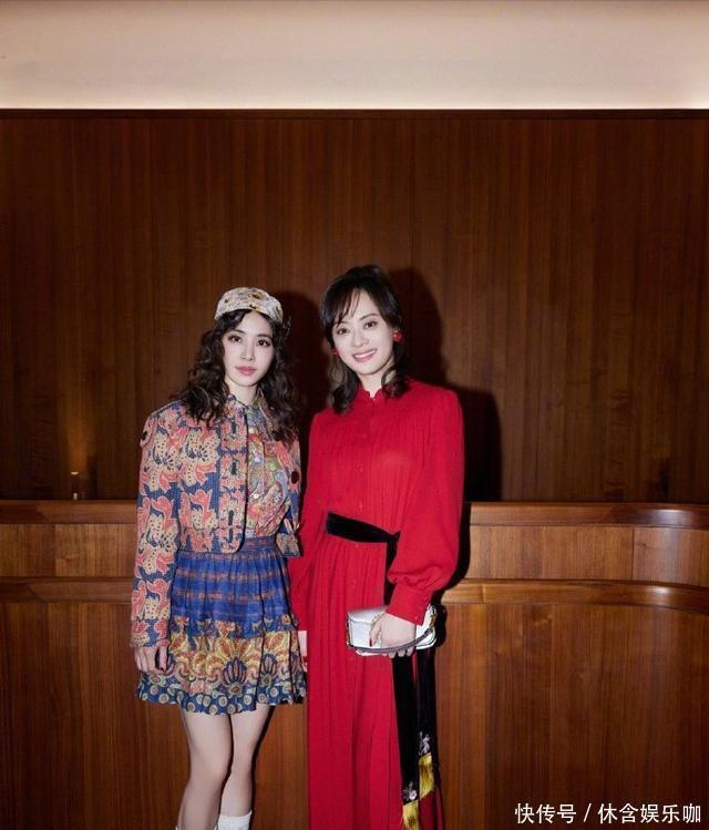 头上戴着同色系的帽子,妆容精致状态也相当好。一旁的孙莉穿红色的衬衫长裙,搭配一个黑色带金流苏腰带状态也很好。最重要的是她终于不是微商头了,这次做了小卷还是很惊艳的。
